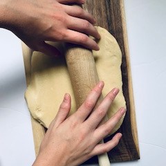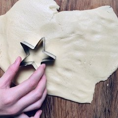 - Line a baking sheet with parchment paper. Roll out dough on a flat surface and use a cookie cutter to cut out about 12 cookies.