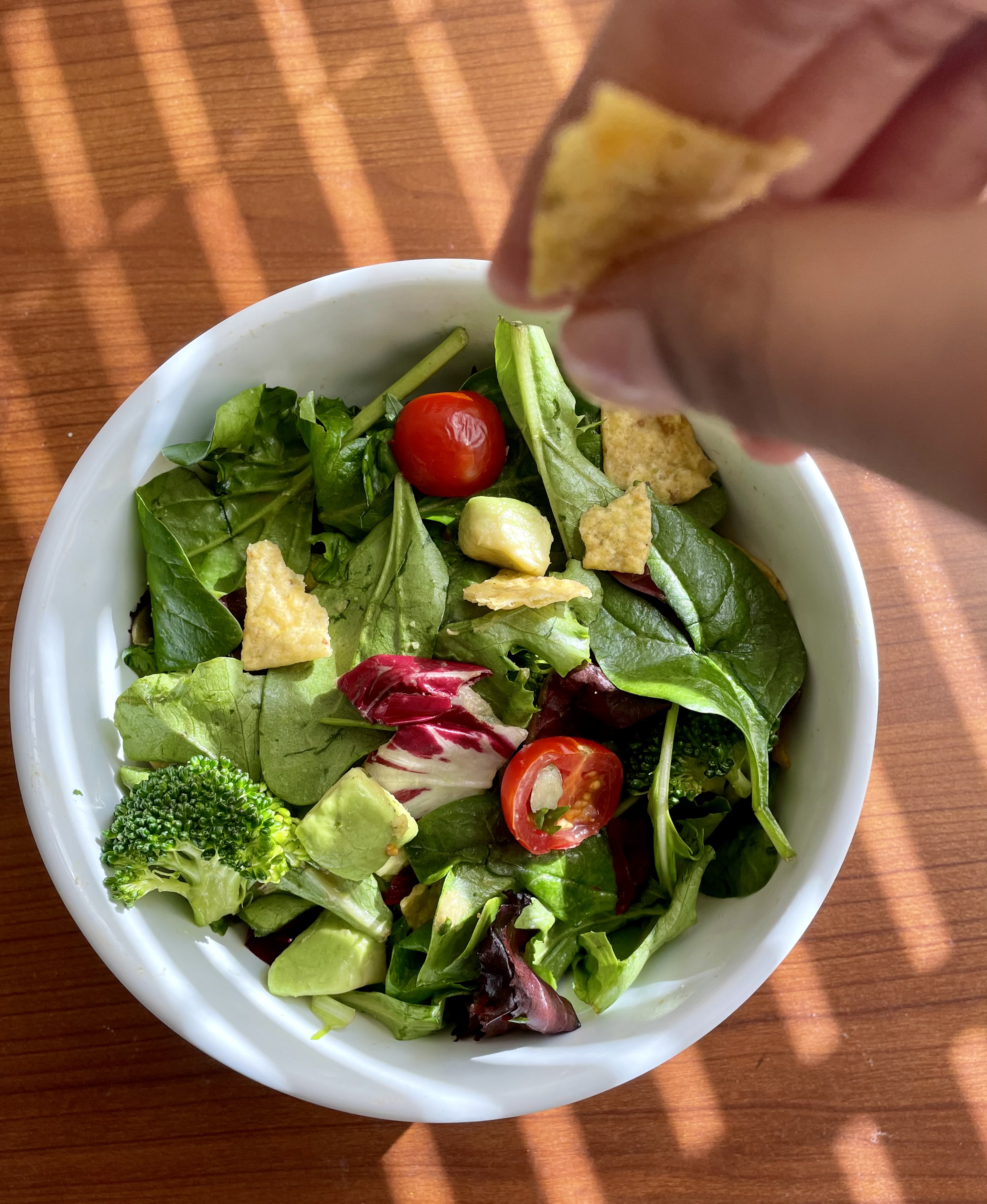 - Now toss in the broccoli, avocado, berries, cherry tomatoes, tortilla chips, nuts, and seeds.