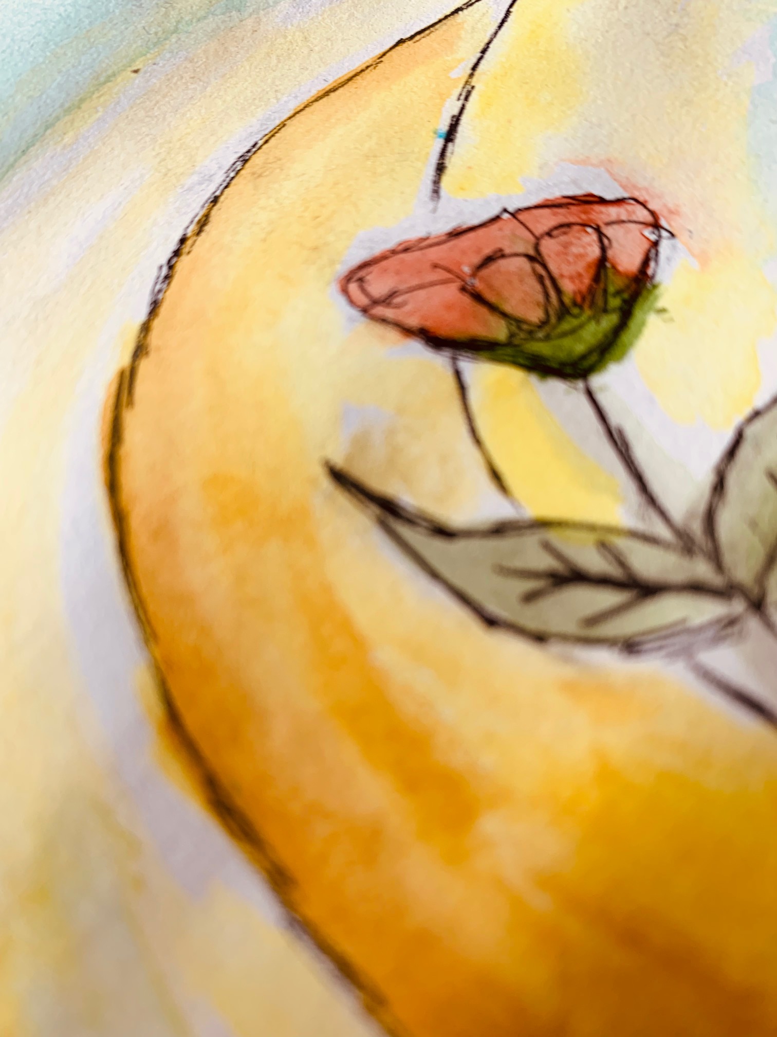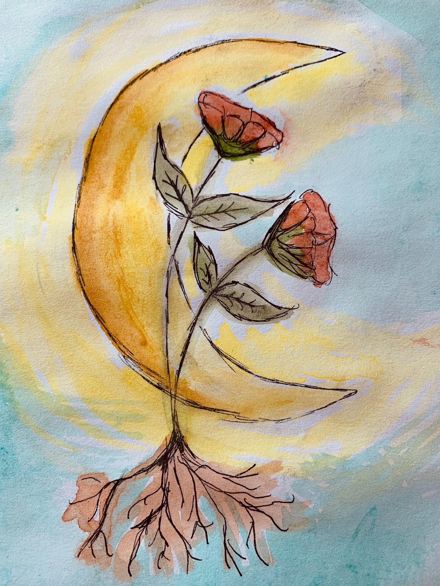 For this month’s sketchbook page, I decided to make a simple watercolor illustration of a moon and flowers. I incorporated lots of contrasting colors to make the drawing pop. You may also notice that I didn’t color in the lines completely, and I did that because I wanted this to look like a rough but also whimsical illustration.