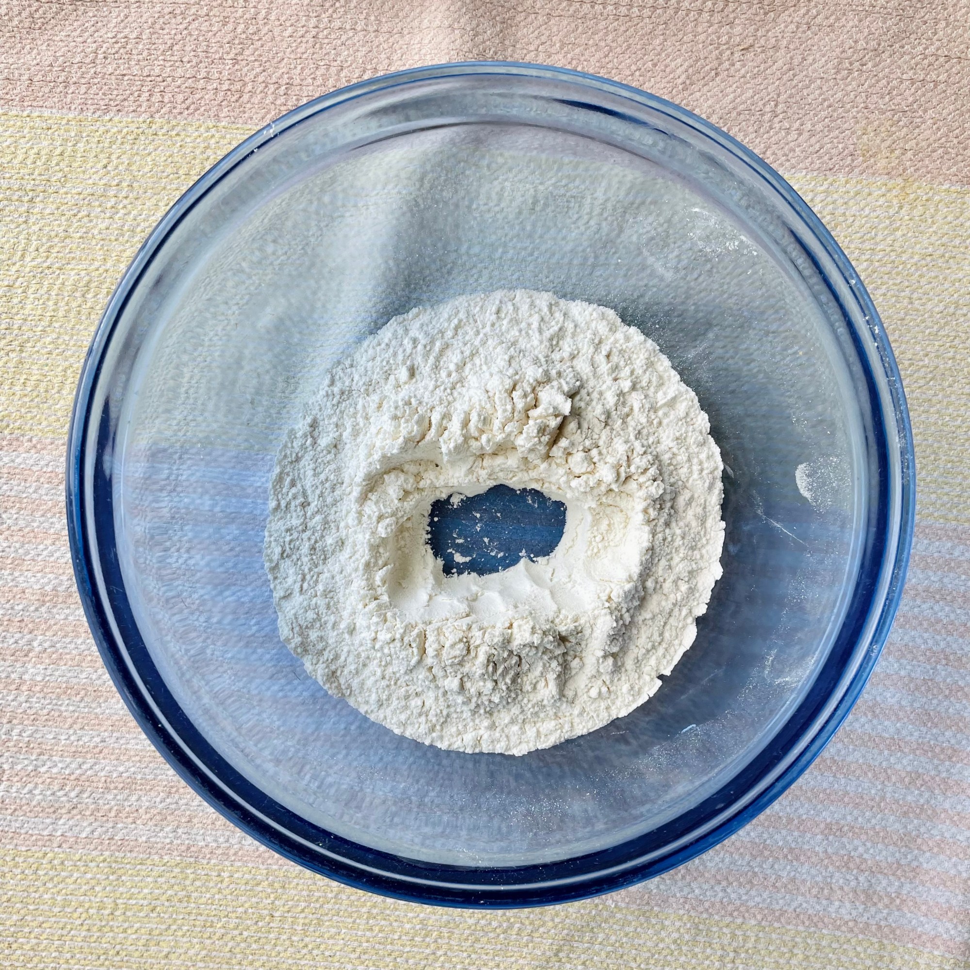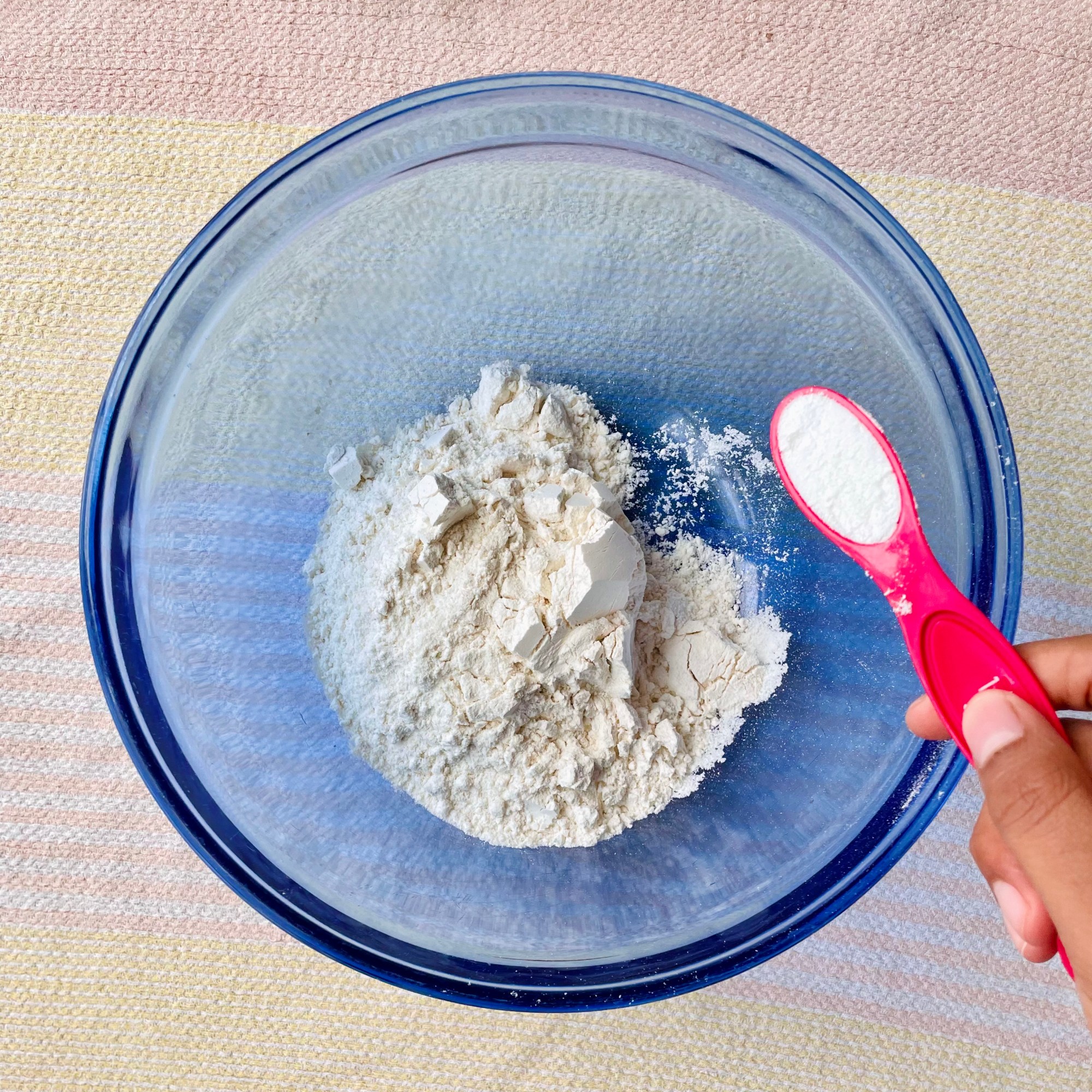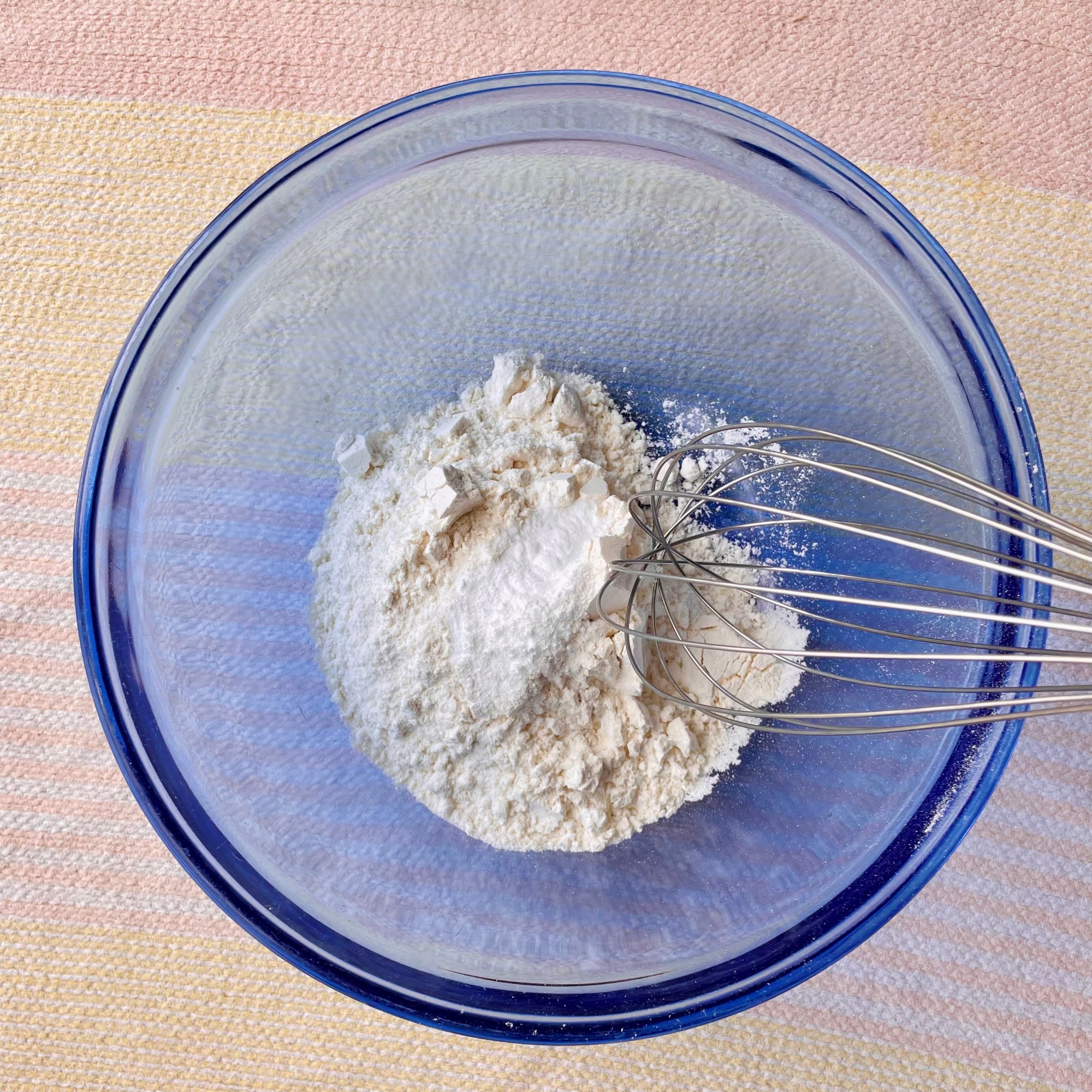 - In a bowl, add in your flour, baking powder, and baking soda. Whisk together