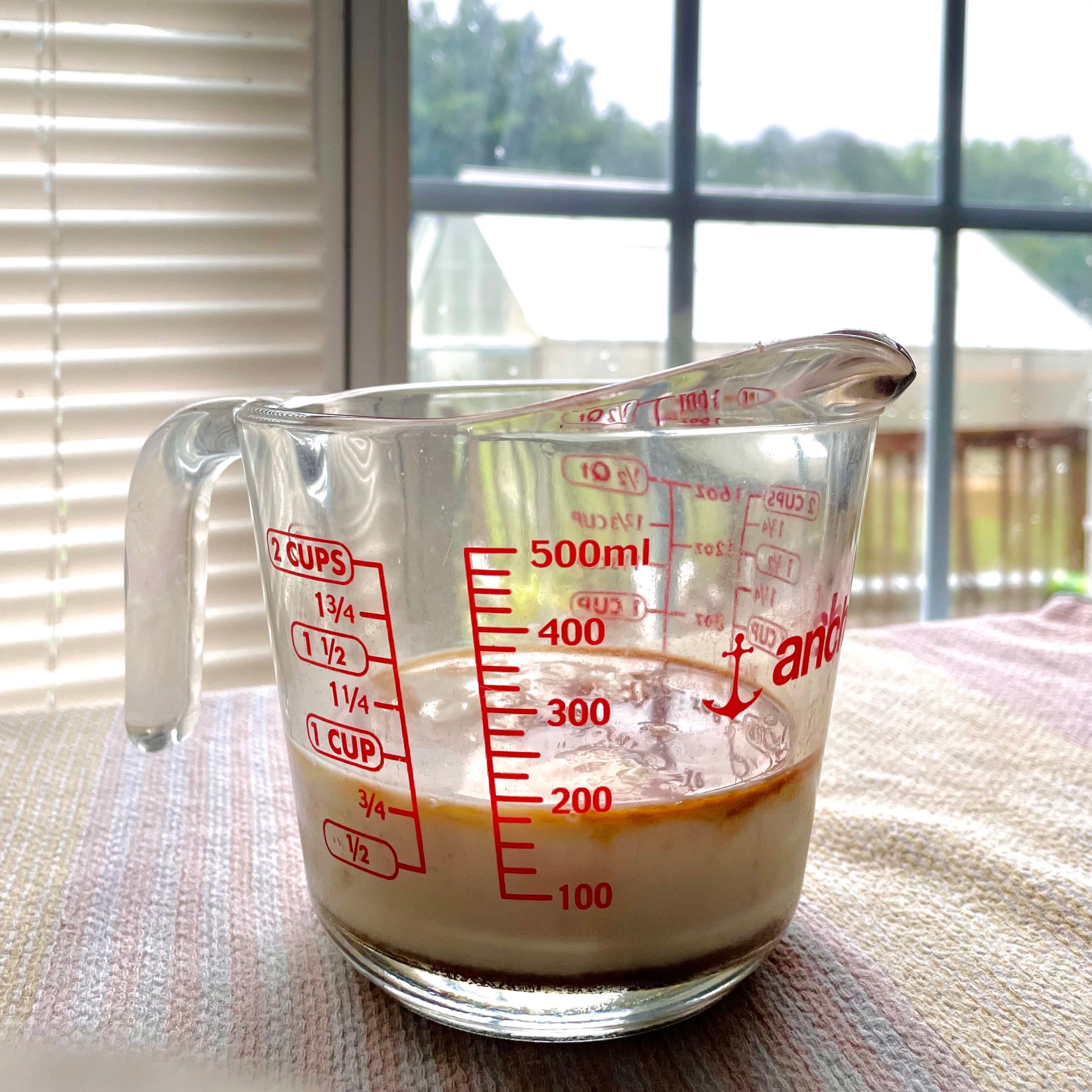 - In a separate bowl or measuring cup, add in your oat milk, vegan butter, sugar, salt, and vanilla extract.
