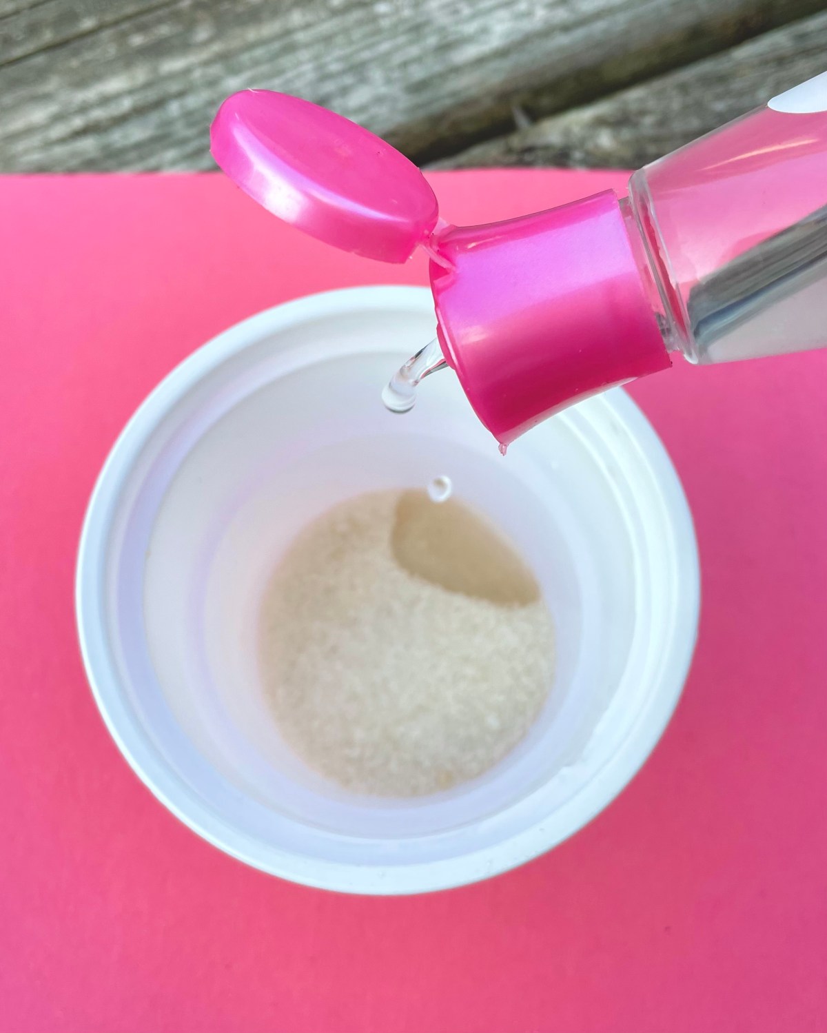 - Then, add in your rose water a few drops at a time. You want to make sure you don’t put in too much so the sugar does not dissolve.