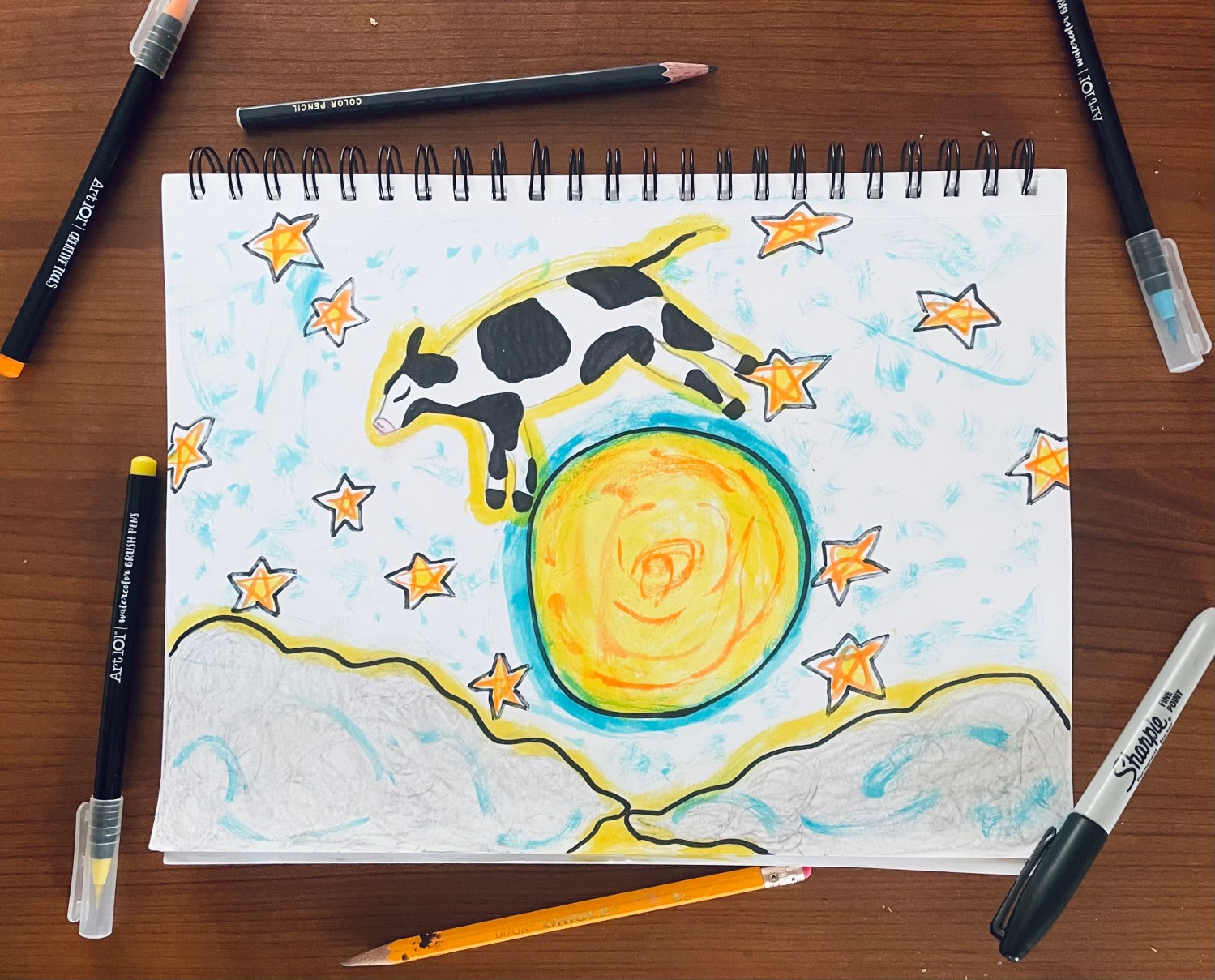 One of the most common things I tell myself about my own art is, “It looks like a little kid drew that!” Every time I say this about my art, I feel worse about my skills, which makes me less motivated. However, it’s impossible to expect great results without practicing first. This realization inspired me to draw something that a little kid would actually draw! I decided to draw a scene from a lullaby that I used to love when I was younger. For this month’s sketchbook page, I drew when, “the cow jumped over the moon.”