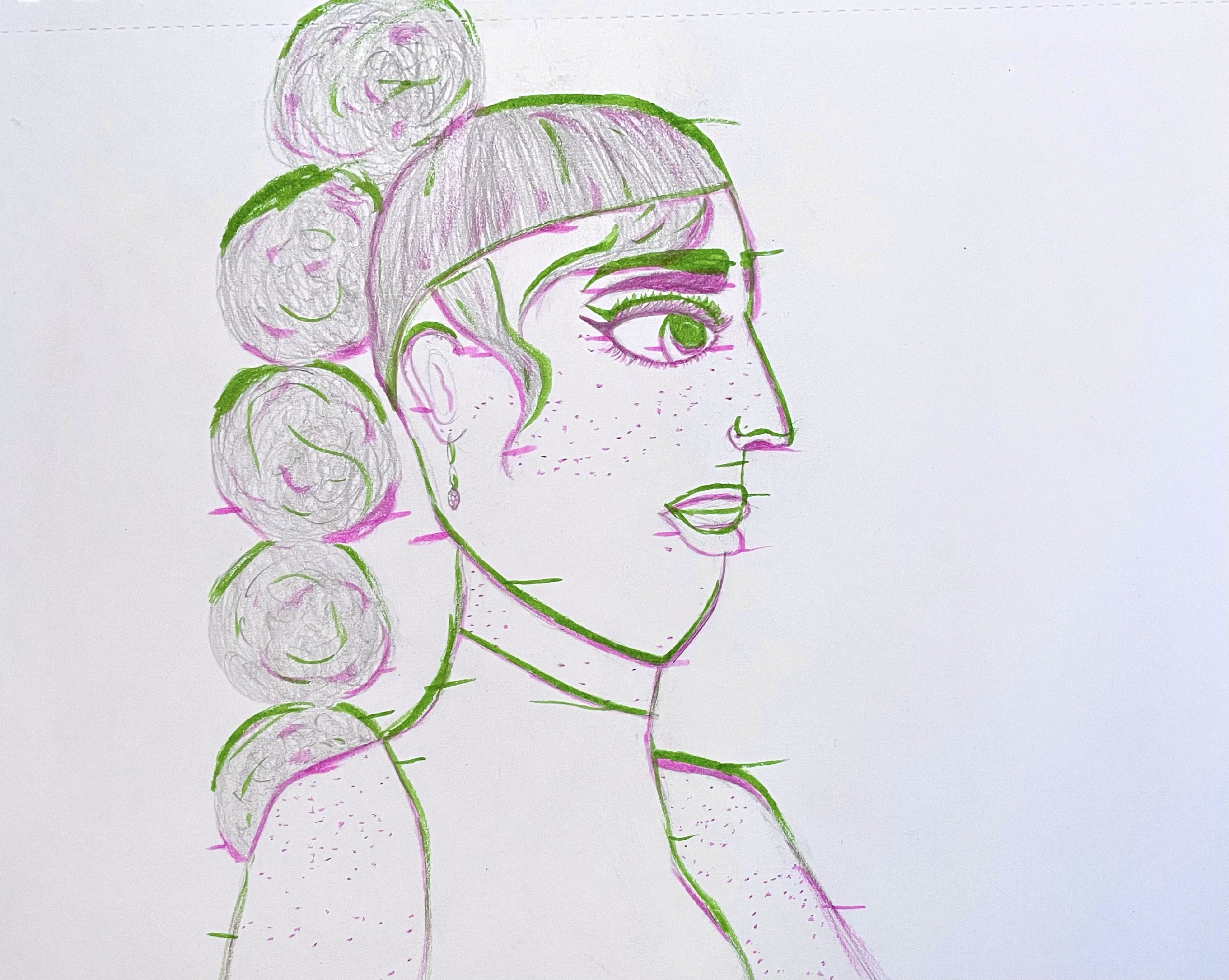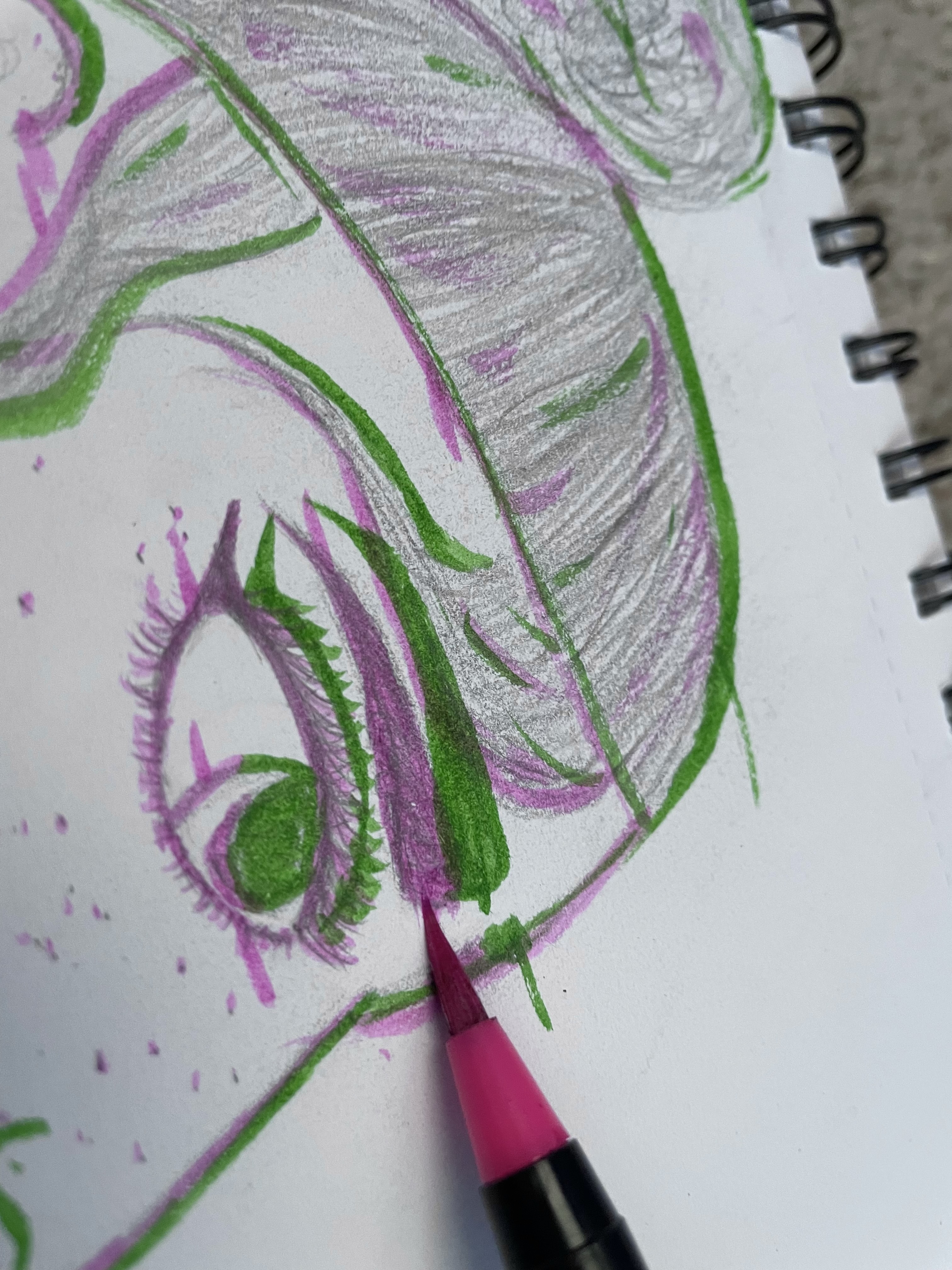 In this page, I tried to add some flare to my drawing by giving it a glitch effect. I started off with a simple pencil sketch and then took a photo of it. I edited the photo with a glitch filter and used it as a reference for where to put the green and pink strokes. You can send us a picture of your own glitch drawing at sandazine@gmail.com!