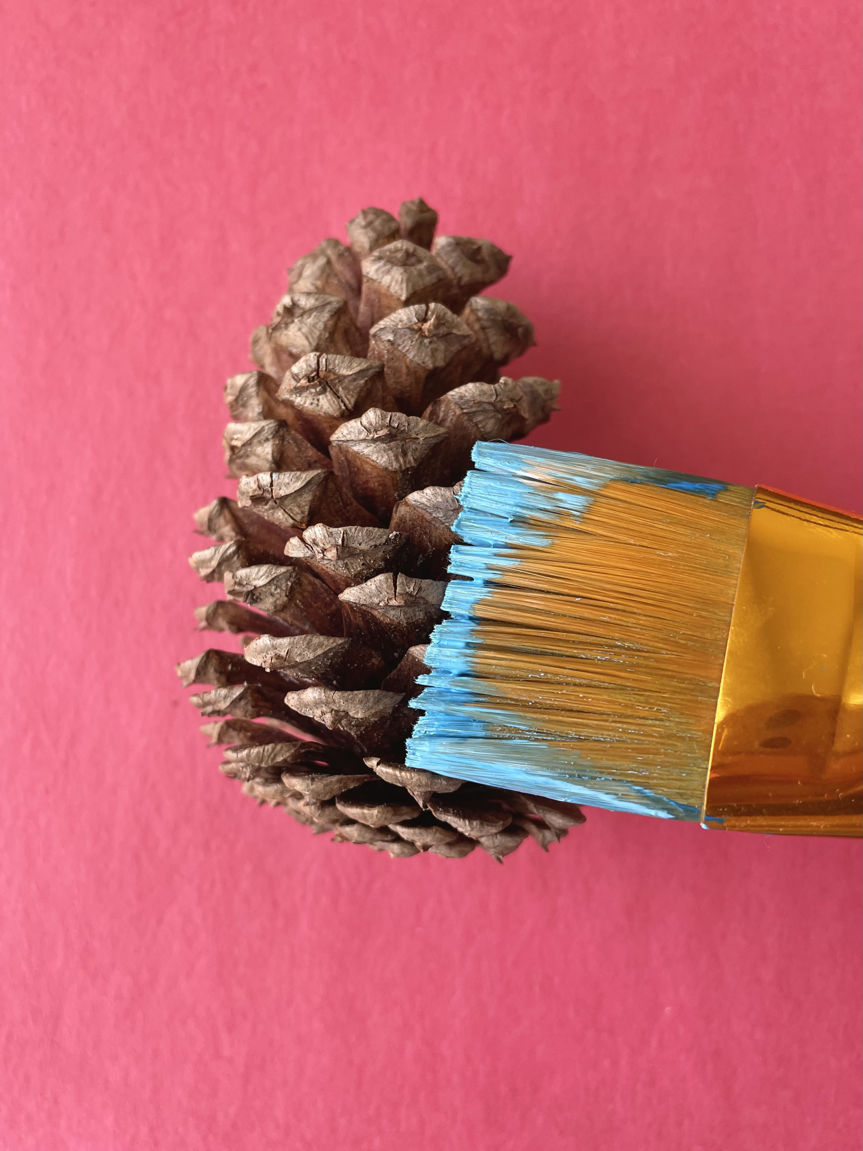 - Pick your colors and start painting! I used a light blue for the base of my pinecone. I also added splutters of white and dark blue to give the pinecone more depth.