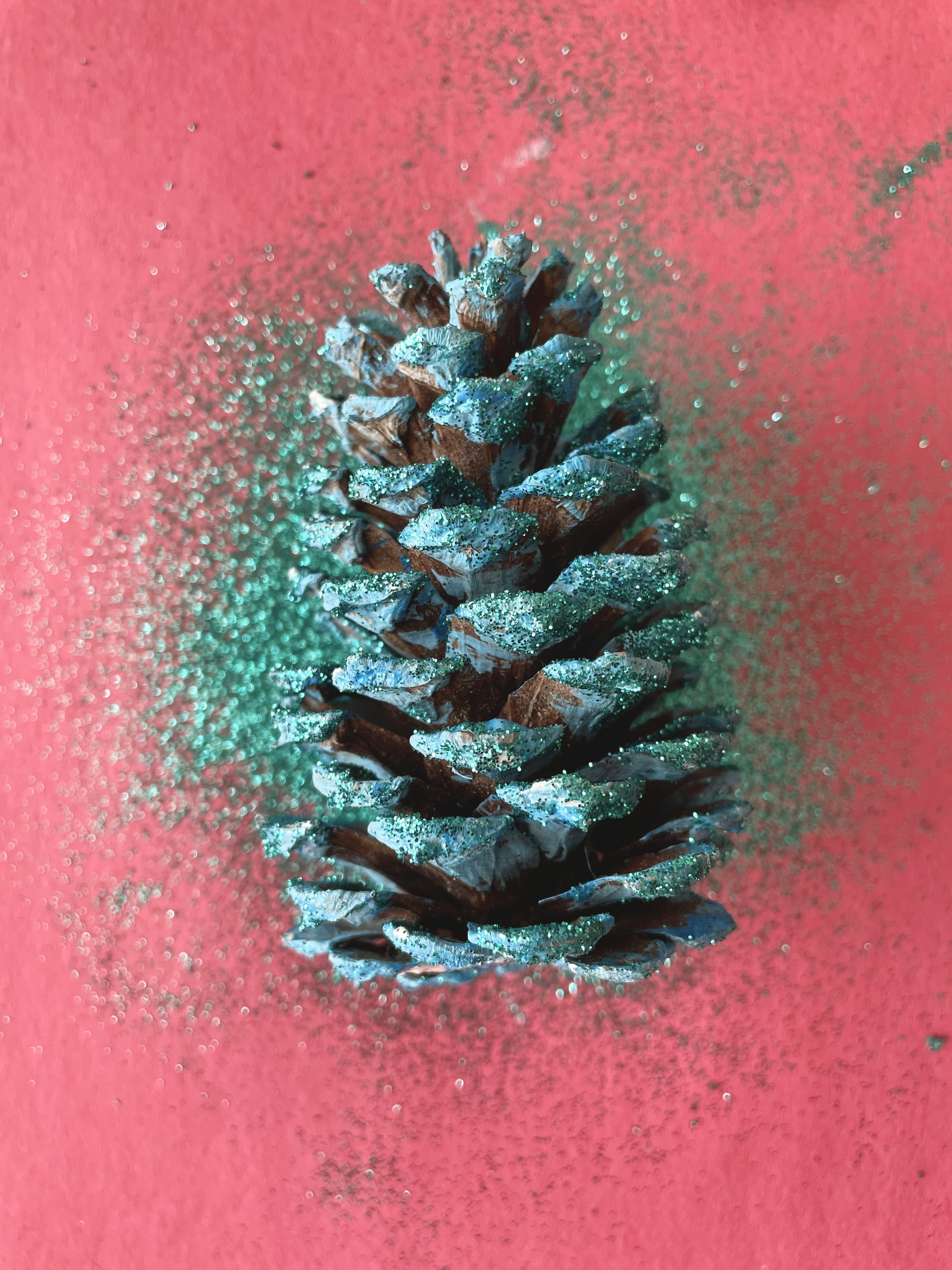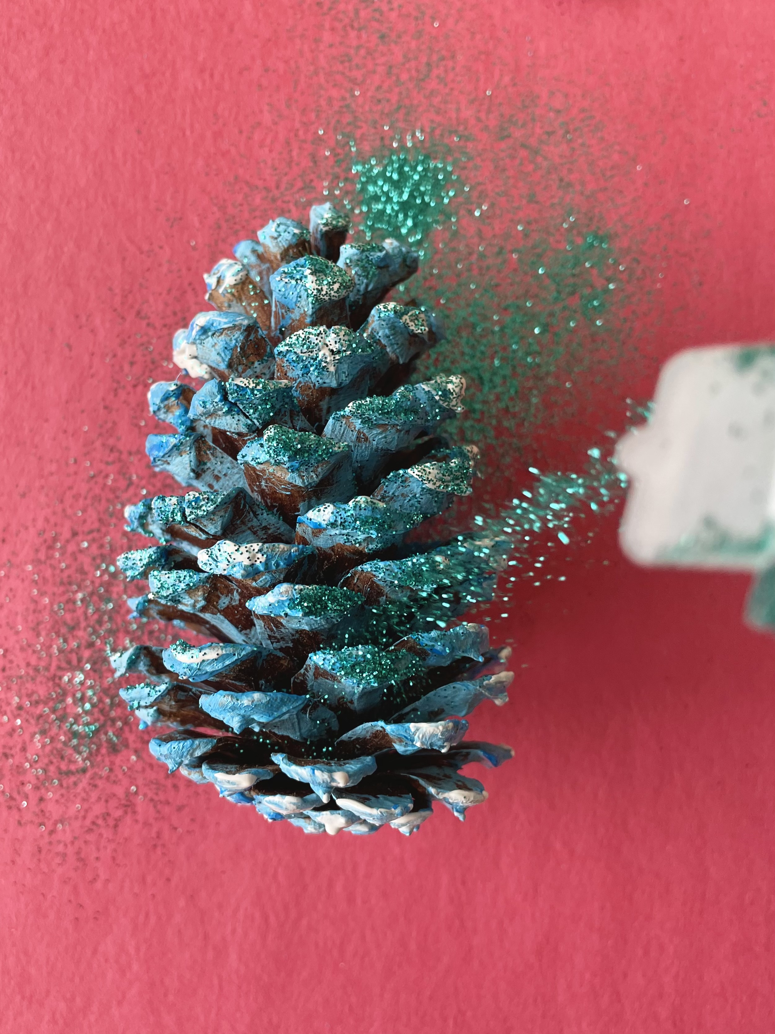 - Wait for the pinecones to dry. Then, add on a layer of Mod Podge to seal in the paint and glitter!