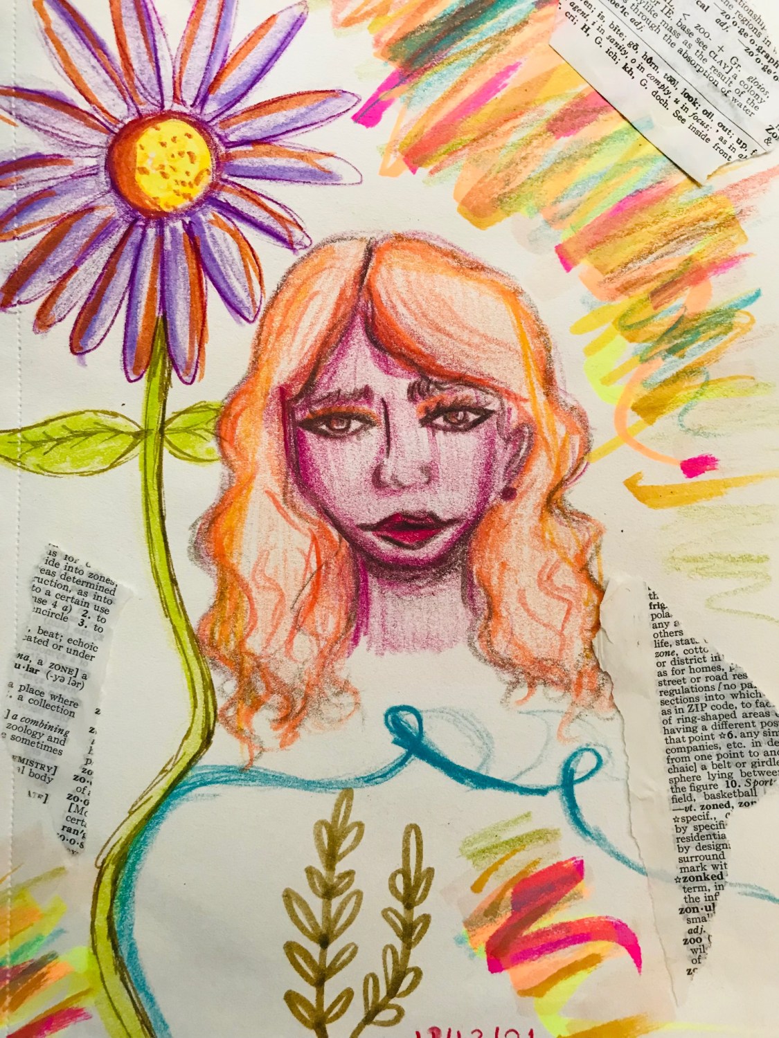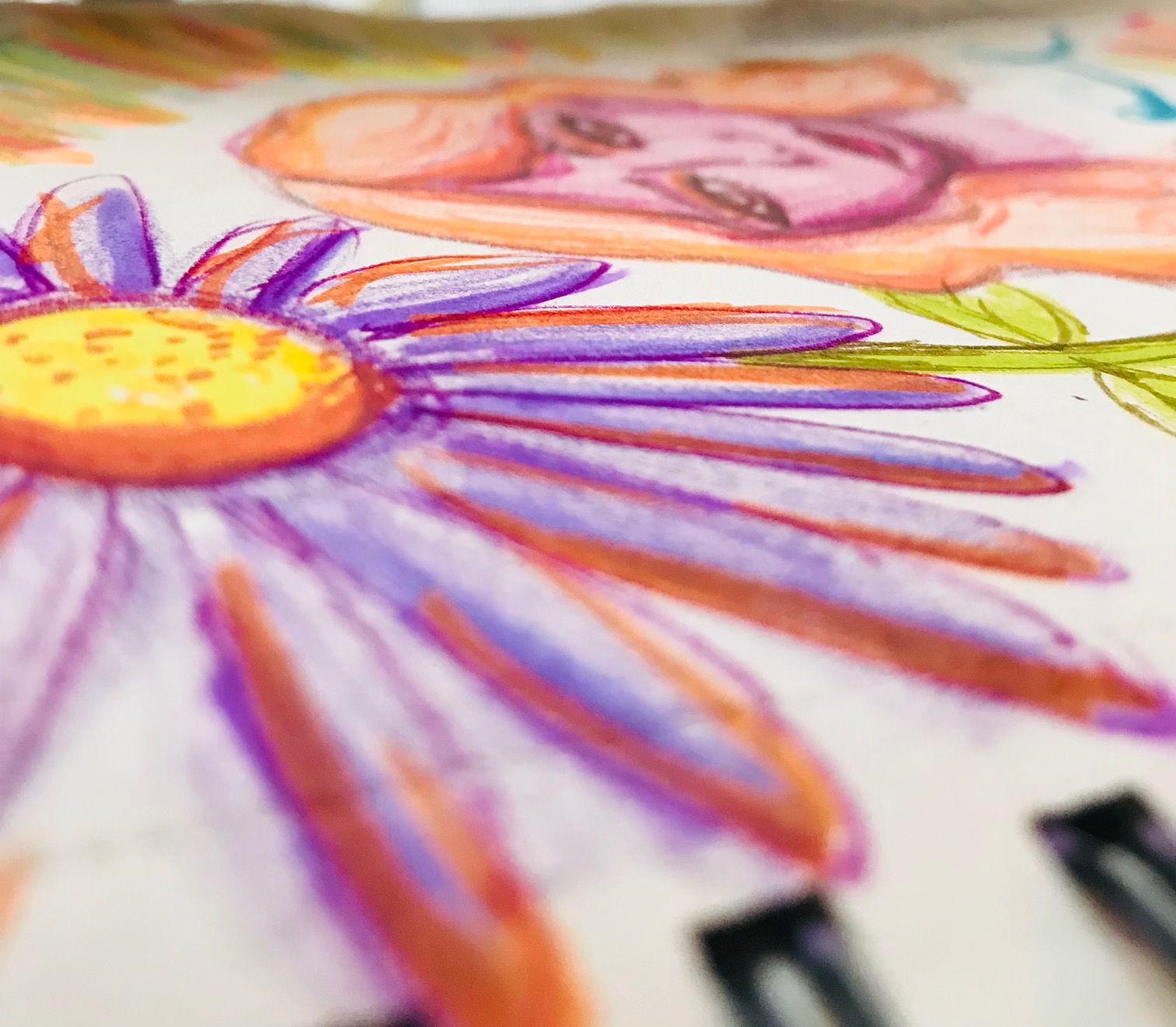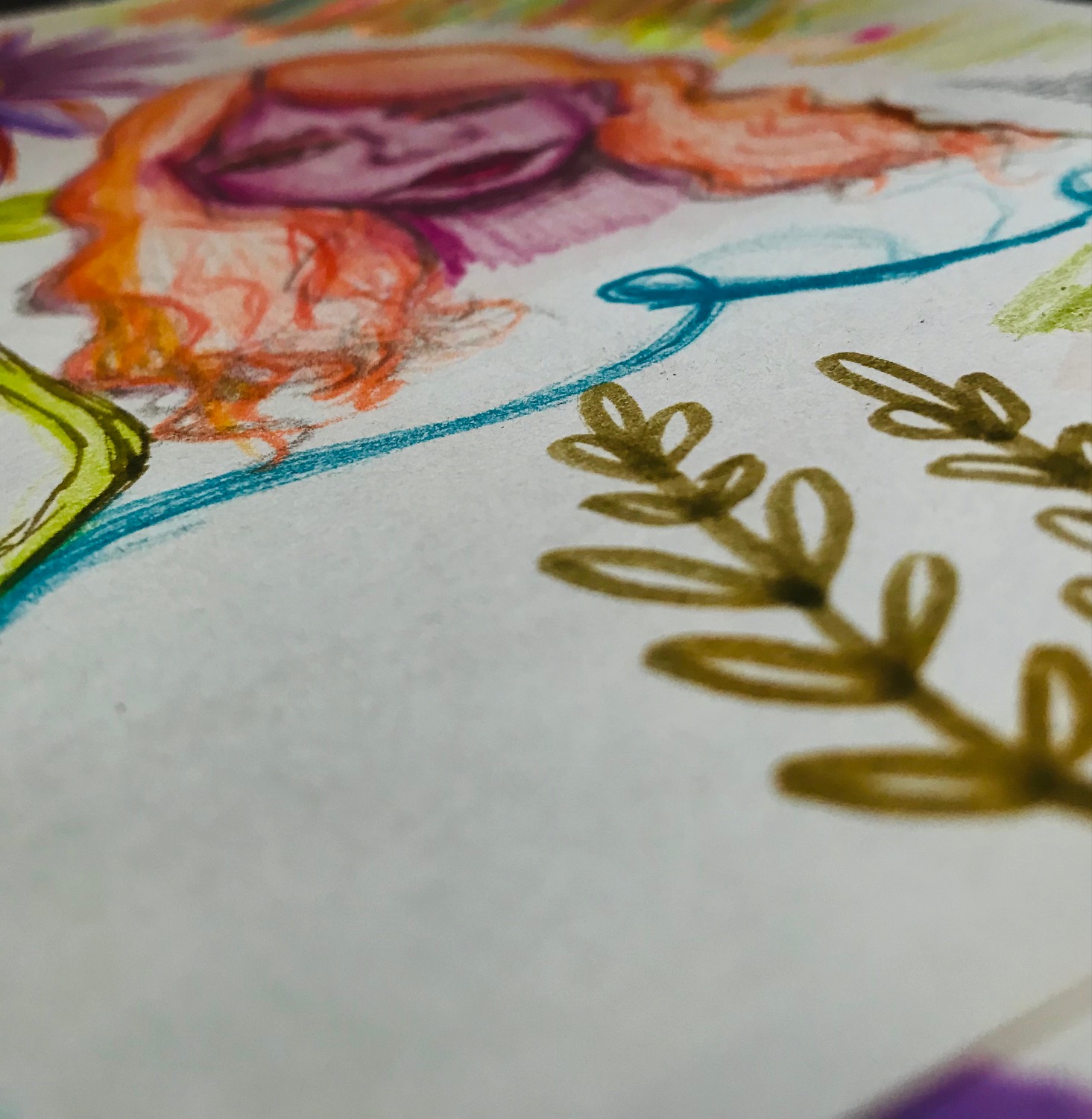 I love experimenting with color, which is why I enjoyed making these sketches so much. By gathering inspiration from 70’s and 80’s psychedelic styles, I was able to create vivid color combinations. I also added scraps of paper from an old book I found to give the page more detail.