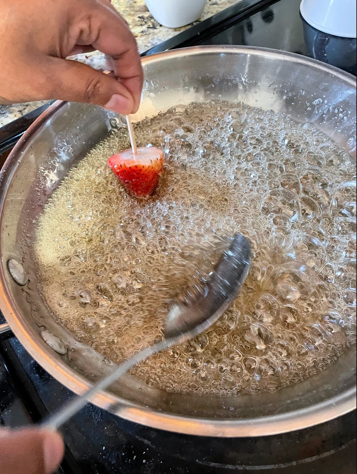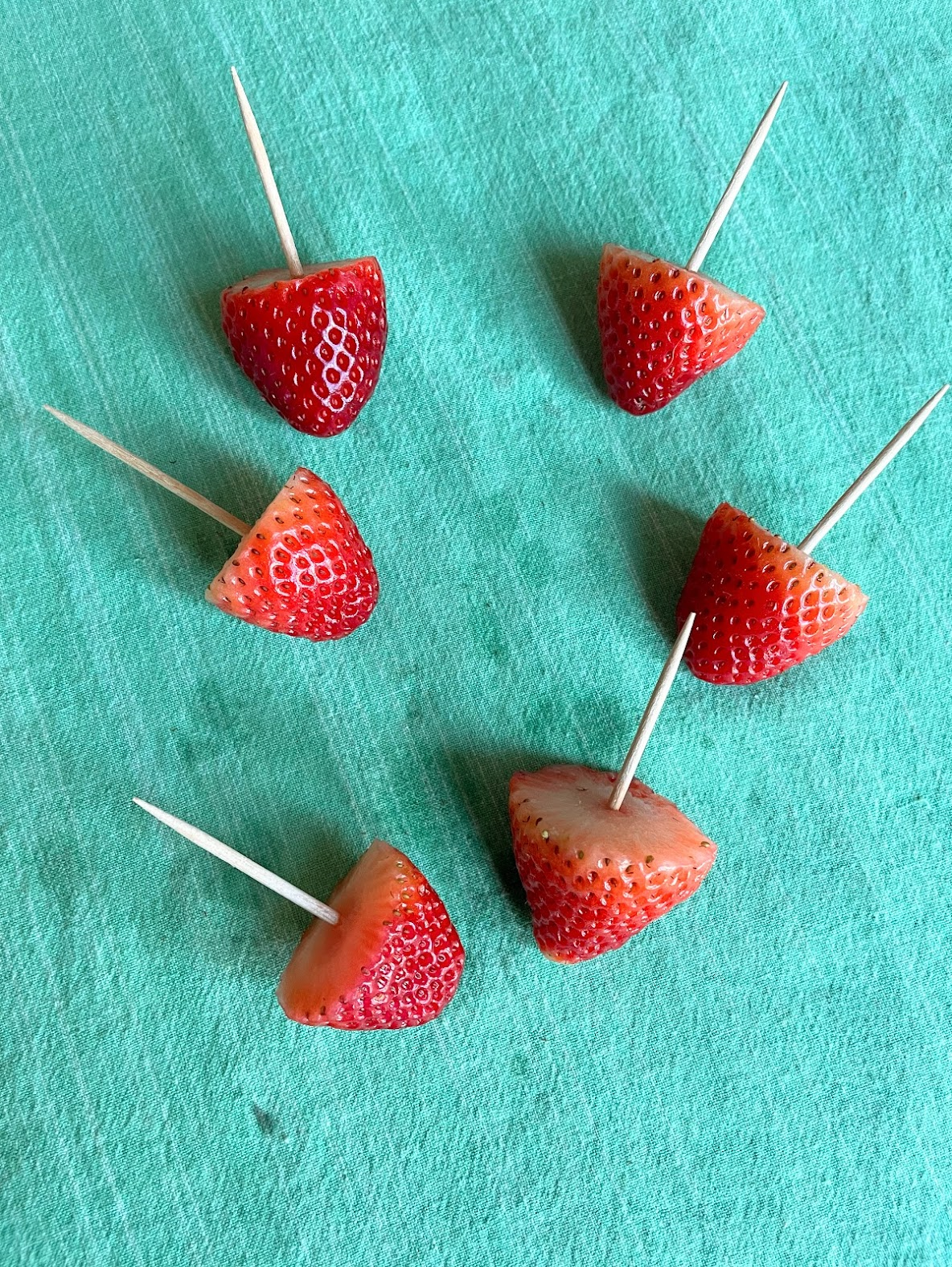 - Put your fuit on the skewers (I put mine on toothpicks because I did not have any skewers.) If you would like a more traditional tanghulu, put 2 or more of an even number of strawberries on the skewer.