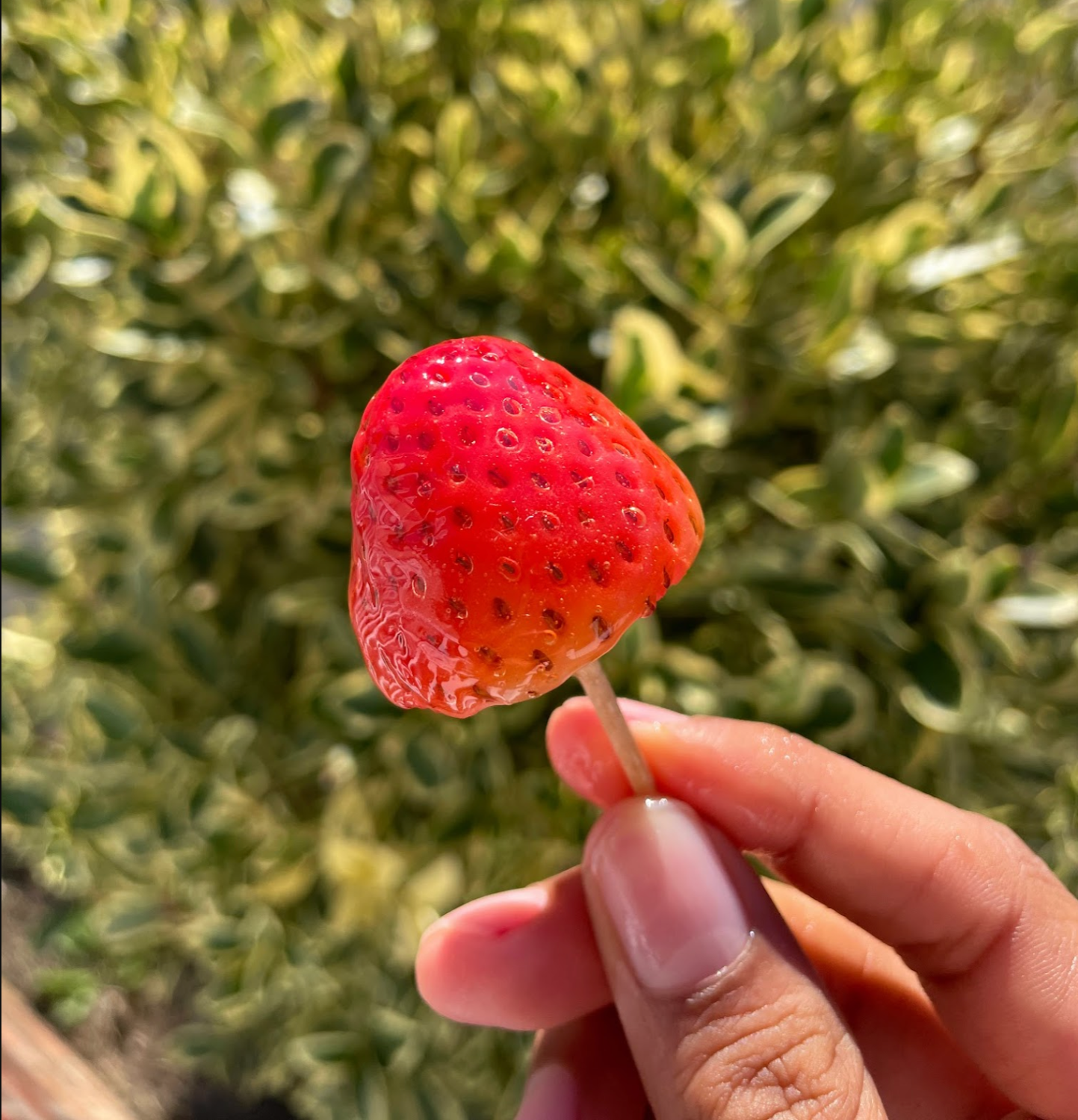This month’s recipe is inspired by tanghulu which is a beloved Chinese street food snack. My recipe is a little different from a traditional tanghulu recipe though because I use granulated sugar instead of Bing Tang. I also did not have any bamboo skewers on hand so I made a mini version with toothpicks. Despite these differences, it is amazing! The crunchy coating on the fruits makes them nice and glossy. The sugar also slightly cooks the strawberries which contributes to a deeper sweet flavor. You can try this recipe out and send us a picture at sandazine@gmail.com!