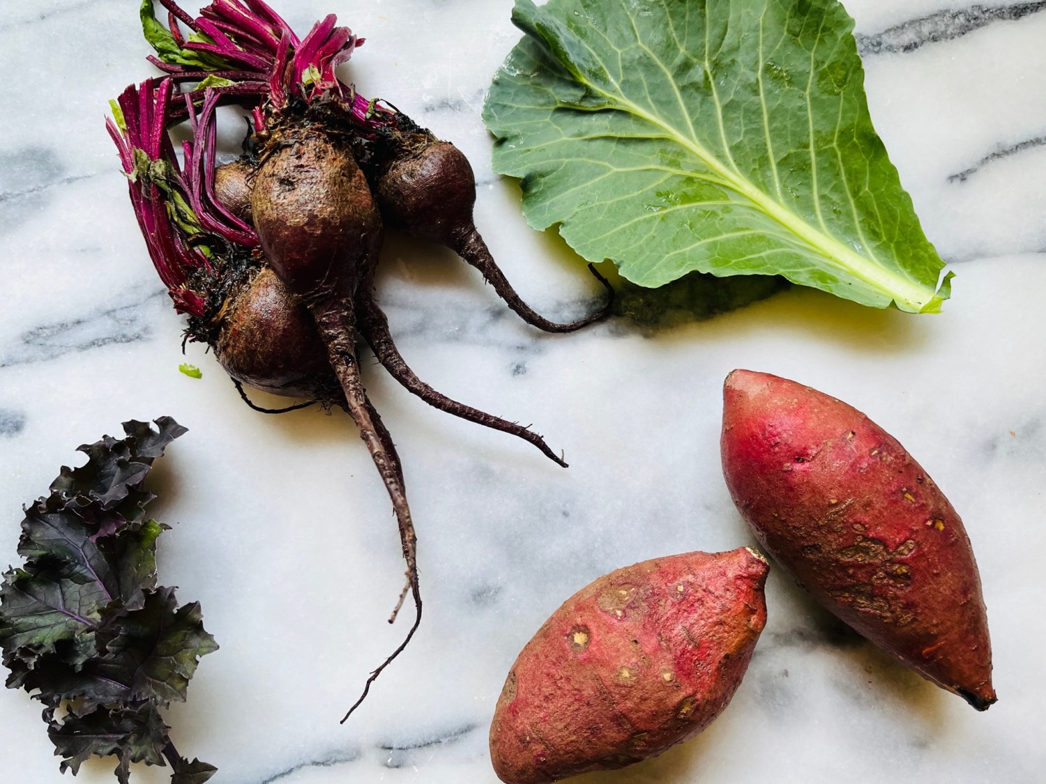 - Cut the beets and potato into thin, evenly-shaped, slices.