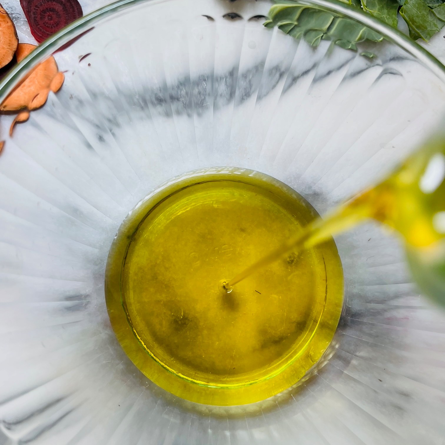 - In a small or medium bowl, combine olive oil, garlic powder and salt making sure to mix well.