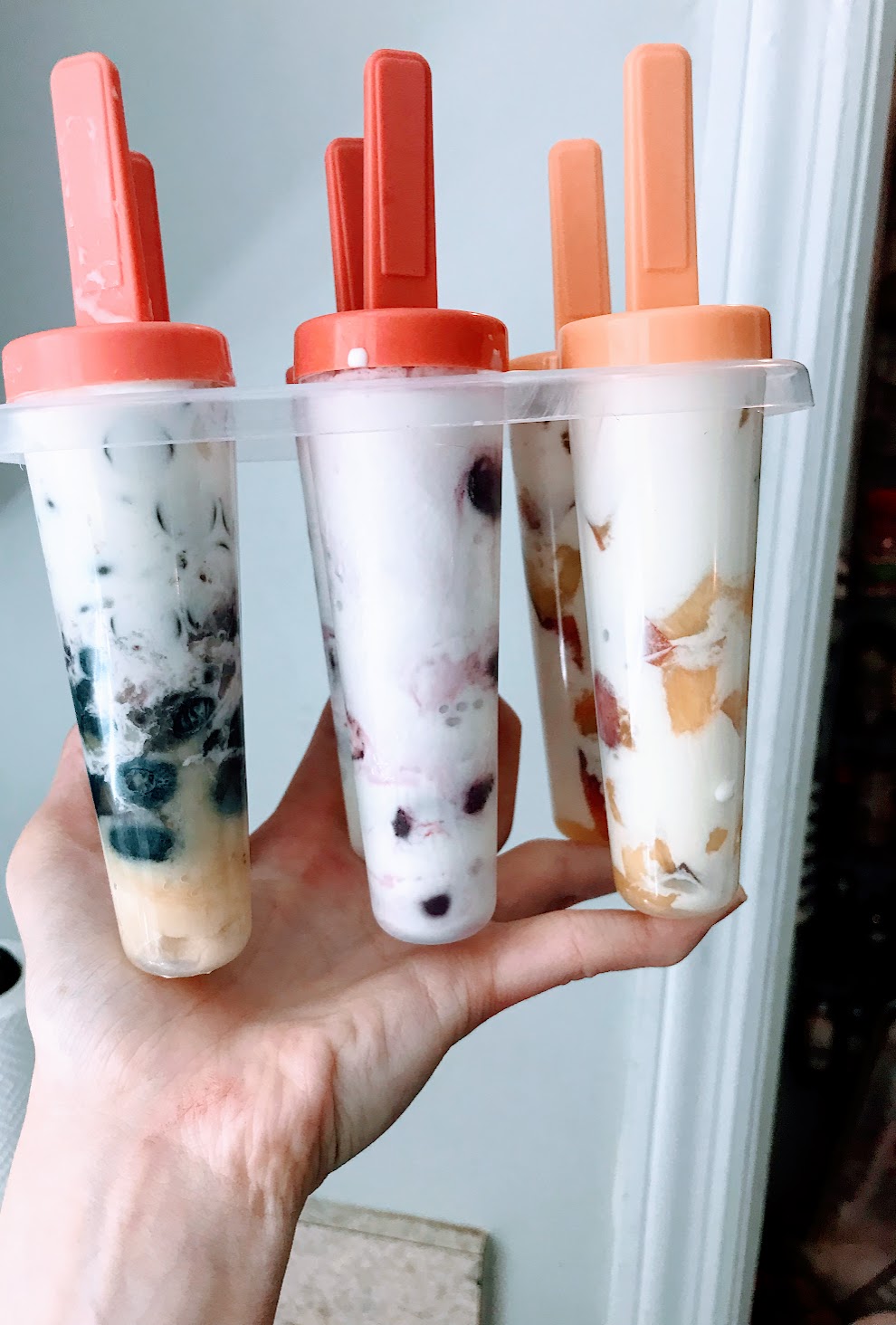 - Chop up the fruit and place it into each popsicle mold. (The combinations I made were peaches & cream, cherries & cream, and bananas, blueberries, chocolate chips & cream)
